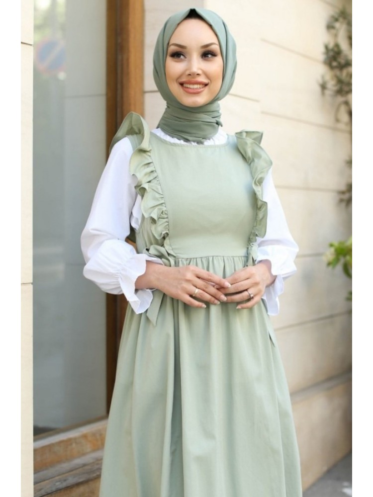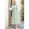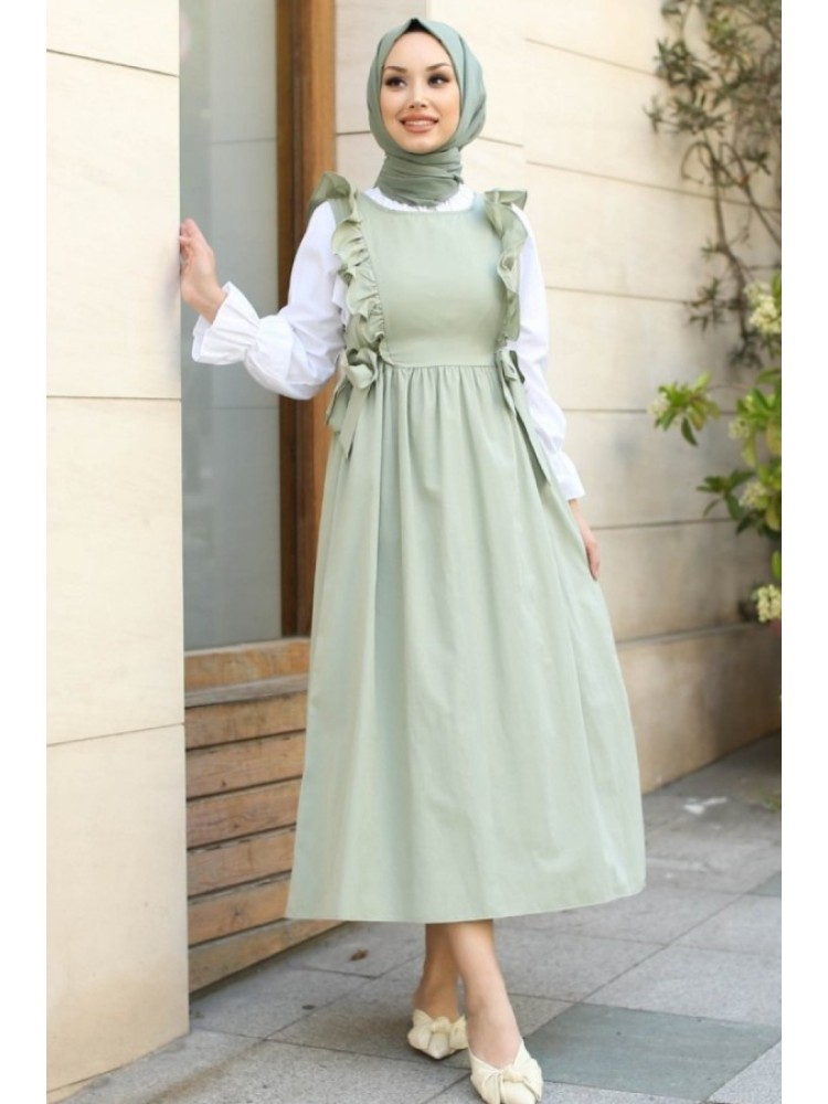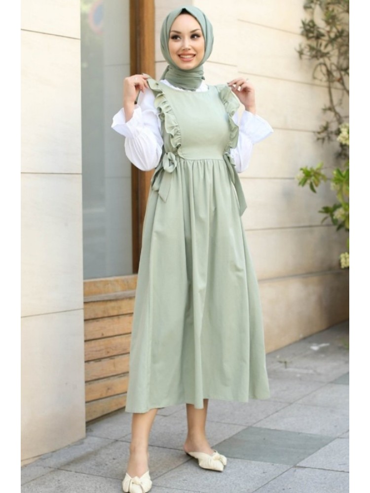 - Ürünümüz terikoton kumaştan üretilmiştir. Boyu ortalama 130cm'dir. Jilemiz tek parça olup, iç kısmında "Carleen Beyaz Gömlek" kombin amaçlı kullanılmıştır. Jilemizin üst kısmında fırfır ve yanlardan bağlama detayı bulunmaktadır. Bel kısmından itibaren etek kısmı genişleyerek inmektedir. Sırt kısmında kullanım kolaylığı açısından fermuar bulunmaktadır. Astarsızdır. Günlük hayatta rahatlıkla kullanabilirsiniz.